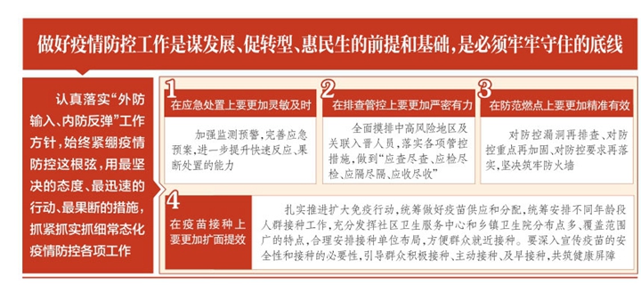 林武在讲话中指出,做好疫情防控工作是谋发展、促转型、惠民生的前提和基础,是必须牢牢守住的底线。要深入贯彻党中央及省委决策部署,认真落实“外防输入、内防反弹”工作方针,始终紧绷疫情防控这根弦,用最坚决的态度、最迅速的行动、最果断的措施,抓紧抓实抓细常态化疫情防控各项工作。一是在应急处置上要更加灵敏及时。加强监测预警,完善应急预案,进一步提升快速反应、果断处置的能力。立足更精准更有效地防,做好发热门诊信息登记和预检筛查,精准开展防控研判,做到早发现、早报告。深入开展疫情防控培训和应急指挥、联合处置演练,做好应对突发情况的各项工作准备,强化督促指导,确保第一时间反应,第一时间决策,第一时间处置,牢牢掌握防控主动权。二是在排查管控上要更加严密有力。全面摸排中高风险地区及关联入晋人员,落实各项管控措施,做到“应查尽查、应检尽检、应隔尽隔、应收尽收”。强化属地“第一落点”管控责任,关口前移,管控前置,实施有效的动态排查,织密织牢管控体系。三是在防范燃点上要更加精准有效。对防控漏洞再排查、对防控重点再加固、对防控要求再落实,坚决筑牢防火墙。要周密做好国际航班经停太原入境防控、进口冷链物流管理、医疗机构院感防控、隔离酒店管理等工作,确保各项工作措施环环紧扣、精准有效、不出纰漏。要以更严格的管理强化校园安全防控,继续做好景区、餐饮、文化娱乐等人员流动性大的场所,养老、救助、儿童福利机构等重点部位的疫情防控工作,严防输入性、聚集性、关联性感染风险。要对入境人员加强管理,设置专用通道,缩短登记转运时间,减少人员聚集交叉感染风险。对医务人员、隔离场所、交通场站一线工作人员等,要持续强化个人防控、健康监测、闭环管理等措施。四是在疫苗接种上要更加扩面提效。扎实推进扩大免疫行动,统筹做好疫苗供应和分配,统筹安排不同年龄段人群接种工作,充分发挥社区卫生服务中心和乡镇卫生院分布点多、覆盖范围广的特点,合理安排接种单位布局,方便群众就近接种。要深入宣传疫苗的安全性和接种的必要性,引导群众积极接种、主动接种、及早接种,共筑健康屏障。