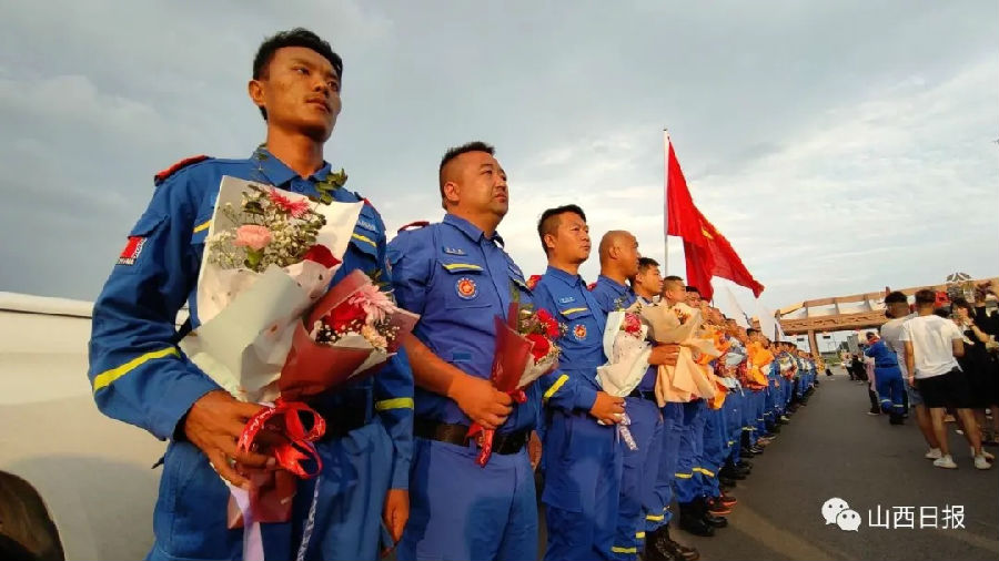 “这些天,我们经历了暴雨、激流,也经历过烈日、蚊虫,都没有合过影,因为我们没有时间。其实我们哪是什么英雄,但山西蓝天救援队只去最危险的地方!面对高难度的救援工作,我们一定不抛弃、不放弃!”站在队伍里,赵帅拿着喇叭,声音沙哑,双眼通红,饱含热泪,向前来迎接的群众表示衷心感谢。