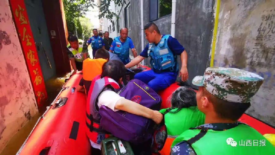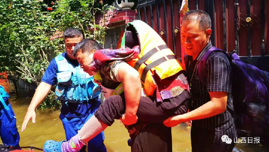 24日下午,新乡牧野区王村镇东马坊村受灾严重,水深有两米多。村里的房子一楼已经全部被淹。一位98岁的老人行动不便,被困在二楼家中。面对紧急情况,长治上党区蓝天救援队队员牛李兵和韩景在舟上做接应,张健负责把舵,老人的儿子和邻居一起加入,成功帮助老人安全登舟。
