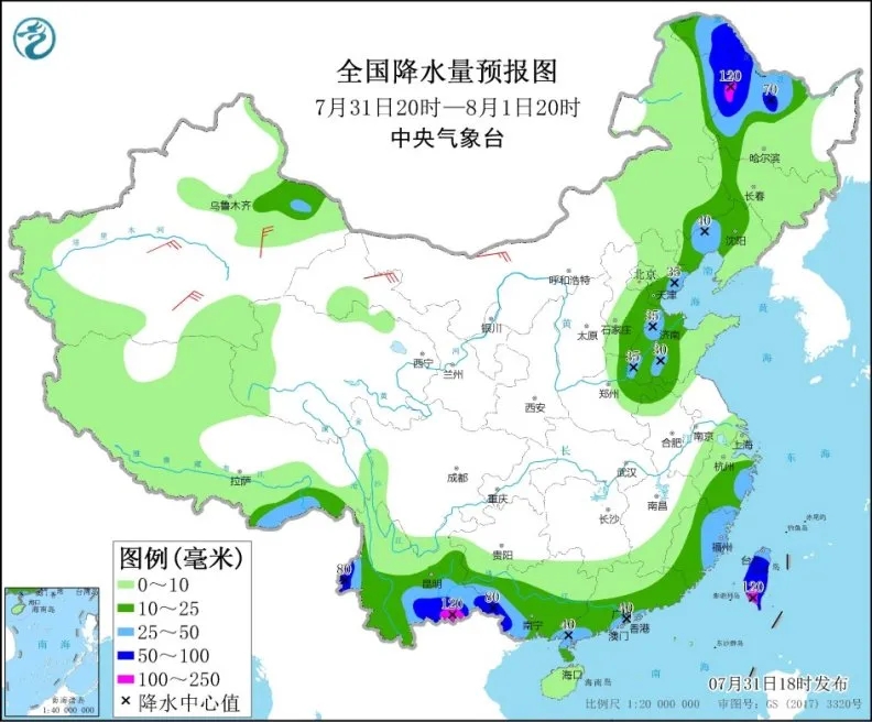 预计,7月31日20时至8月1日20时,内蒙古东北部、黑龙江中西部、辽宁西部、河北东北部、山东西部以及云南西部和东南部、广西西南部、广东中西部沿海、福建东北部、浙江中南部沿海、台湾岛等地的部分地区有大雨或暴雨,其中,内蒙古东北部、黑龙江西部、云南东南部、台湾岛南部等地局地有大暴雨(100~120毫米);上述大部地区伴有短时强降水(最大小时降雨量30~50毫米,局地可超过80毫米);此外,黑龙江中西部、河北中东部、天津、山东中西部、河南东北部等地的部分地区将有8~10级雷暴大风或冰雹天气。为此,中央气象台7月31日18时继续发布暴雨蓝色预警和强对流天气蓝色预警(见图1)。
