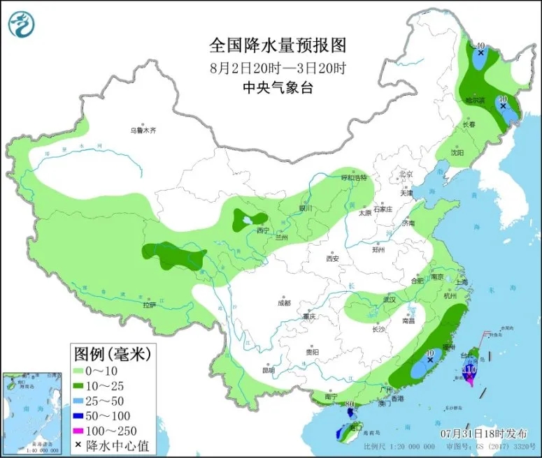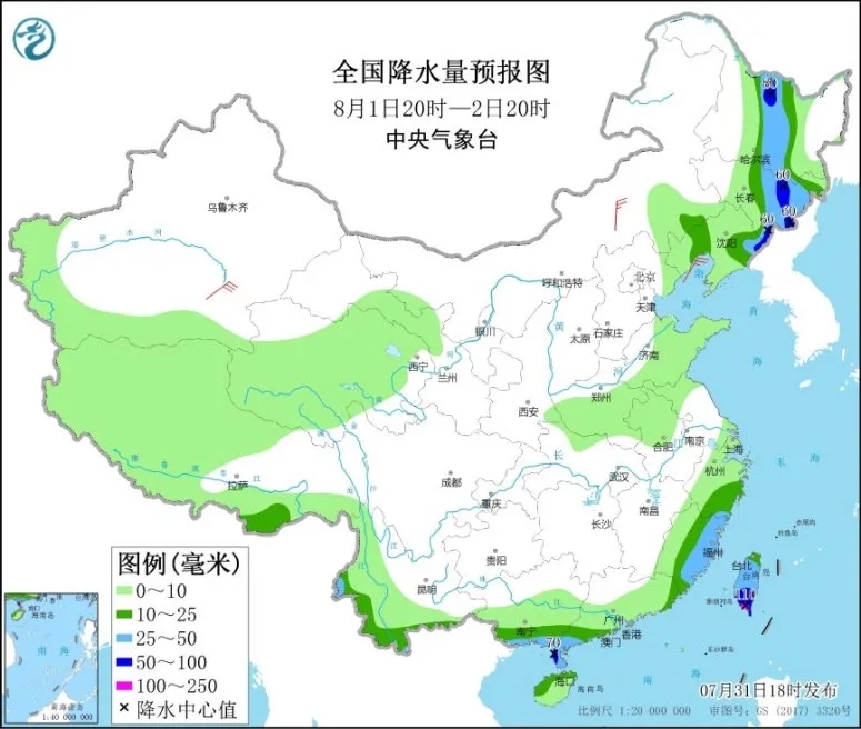 8月1日20时至2日20时,东北地区中东部、江南东部、华南南部沿海、台湾岛等地的部分地区有中到大雨,局地暴雨或大暴雨(100~110毫米)。内蒙古中东部等地部分地区有4~6级风(见图3)。
