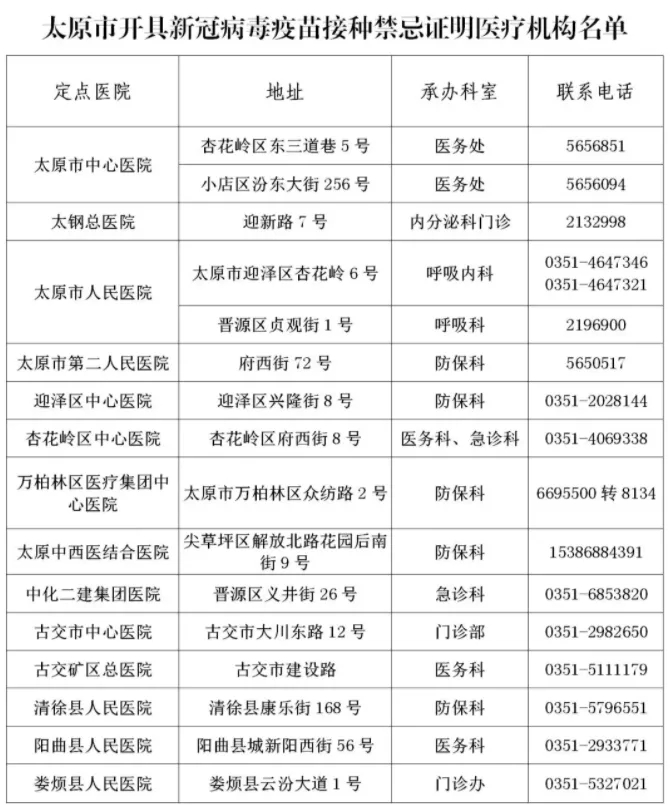 开具接种禁忌证明的医疗机构须为二级及以上公立医院。太原市目前指定14所医疗机构为定点医院,名单如下: