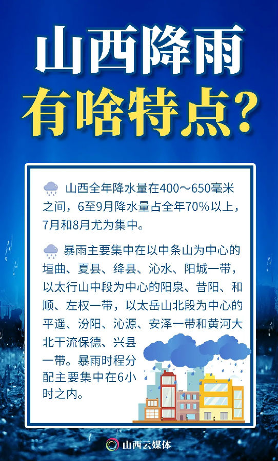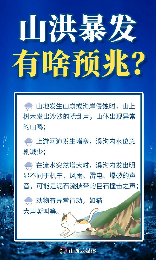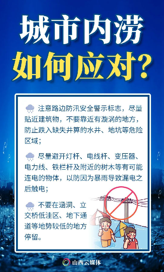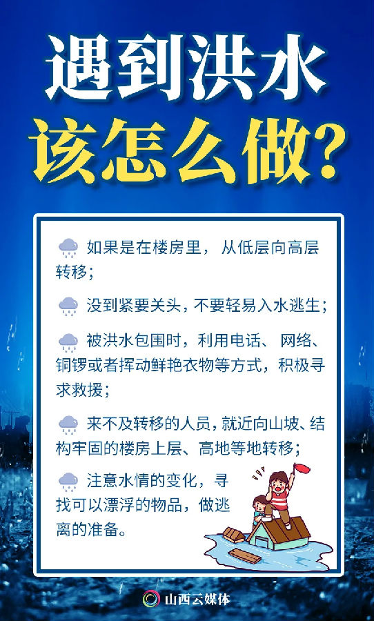 秋季,是防汛减灾的关键时期。山西降雨、洪水有哪些特点?遇到洪水时如何自救?外出行走时,遇到城市内涝怎么办?5张海报,认识暴雨洪水,科学防灾减灾。