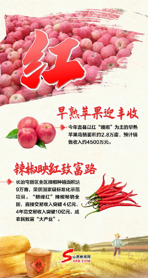 金黄的谷子垂下饱满的穗子火红的辣椒装点着希望的田野……三晋大地,色彩斑斓迎丰收就在这个丰收的季节我们迎来第四个中国农民丰收节下面请跟随我们的“调色盘”一起来欣赏山西瓜果飘香谷满仓的丰收景象