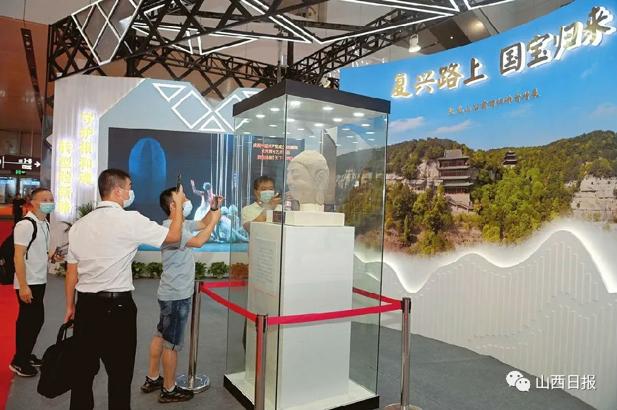 山西日报记者孙蕊报道 国宝归来,万众瞩目。9月23日,第十七届文博会开幕当天,被安排在山西展区入口醒目位置的“复兴路上 国宝归来”特展就吸引了众多参观者驻足,拍照、赞叹、仔细询问。
