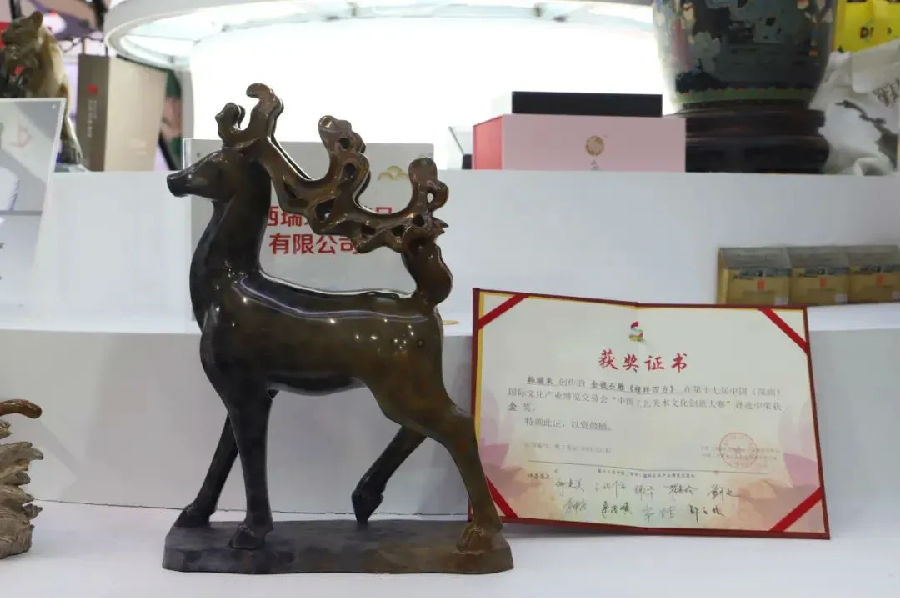 在本届文博会“中国工艺美术文化创意大赛”评选中,由山西工艺美术大师韩瑞来创作的金钱石雕《禄祥四方》荣获金奖,这也是山西代表团在本届深圳文博会上唯一一件获金奖作品。