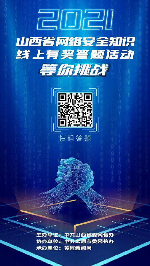 为深入宣传贯彻《网络安全法》等相关法律法规,进一步普及网络安全知识,提升全社会网络安全意识和防护技能,在2021年国家网络安全宣传周即将到来之际,由中共山西省委网信办主办、中共太原市委网信办协办、黄河新闻网承办的“2021山西省网络安全知识线上有奖答题活动”正式启动。