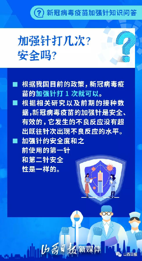 当前,我国疫情防控形势依然严峻,接种疫苗仍是最有效的预防手段。目前,太原市新冠病毒疫苗加强针接种工作已开始。那么,加强针要打几次?安全吗?太原市疾控中心针对有关内容作详细解答。