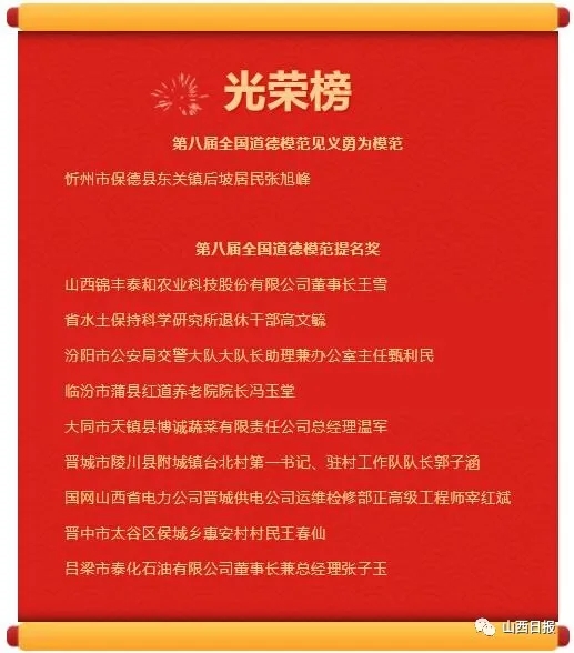 11月5日,第八届全国道德模范表彰活动在北京举行。我省忻州市保德县东关镇后坡居民张旭峰获得第八届全国见义勇为道德模范荣誉称号,另有9人获得全国道德模范提名奖。