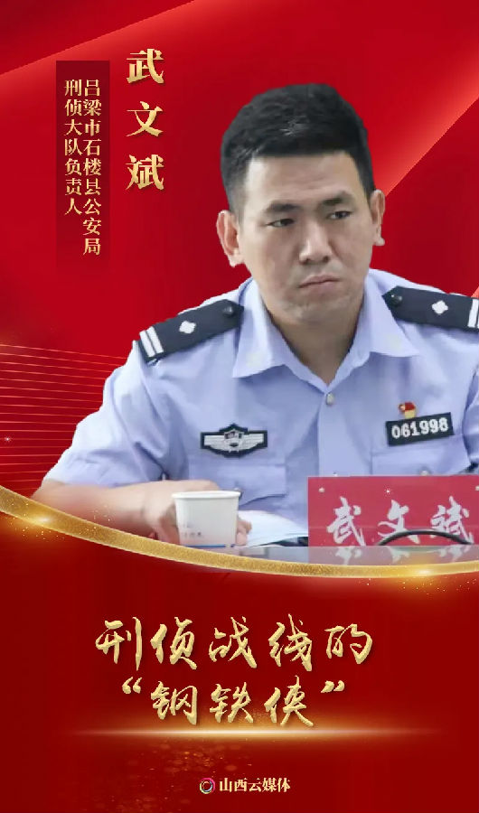从警13年,武文斌始终奋战在打击犯罪的第一线,破获400余起大案要案,被同事们称为石楼县公安局的“钢铁侠”。因长期办案,他两次受伤,膝盖髌骨骨折、脚踝粉碎性骨折,2条长约40厘米的钢板和4颗直径3毫米的钢钉永远成为他身体的一部分,被鉴定为八级因公伤残。