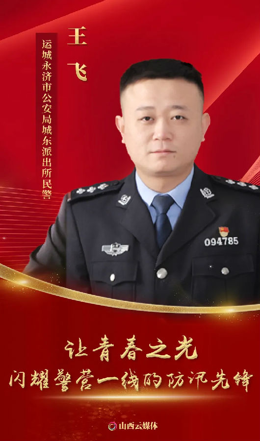 今年夏天,永济市遭受特大暴雨,王飞和同事每天淌着积水深入辖区巷陌排查。在排查到立交桥底时,一位年龄大的老奶奶突然被水冲倒,王飞不会游泳,但他毫不犹豫直接扑进水中,奋力抓住老人,与同事配合将人救出。防汛期间,王飞连续奋战十余个昼夜,入户走访600余户,排查辖区危房17处,消除潜在安全隐患6处。