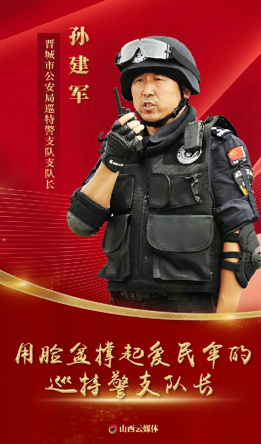 今年7月11日,晋城遭受了64年以来最强暴雨袭击,孙建军第一时间带领八名特警队员到达市区地势低洼的上辇社区开展营救工作。救援期间,他发现被困群众中有一名1岁多的孩子,为了确保孩子安全,他不顾雨势凶猛,艰难趟过近2米深的积水,找来门板和脸盆,让孩子坐在门板上,他一手拖着孩子脖子,一手拿着脸盆为孩子挡雨,将孩子转移到安全地带。一时间,“暴雨中的脸盆伞”登上热搜,阅读量短时间破亿,成为山西公安闪亮的爱民符号。