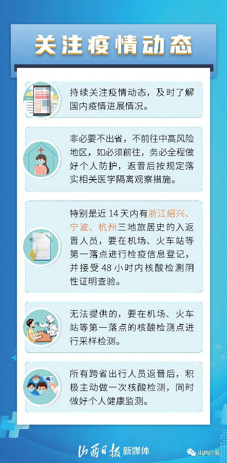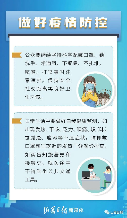 近期,内蒙古、黑龙江、浙江、陕西等地出现本土疫情,加之元旦春节将至,节日期间人员大流动、流感等呼吸道传染病高发、新冠病毒变异等因素叠加,疫情防控形势复杂严峻。为持续巩固拓展我省本土病例“零发生”成果,为三晋人民身体健康和经济社会高质量发展保驾护航,山西省疾病预防控制中心发出健康提示。