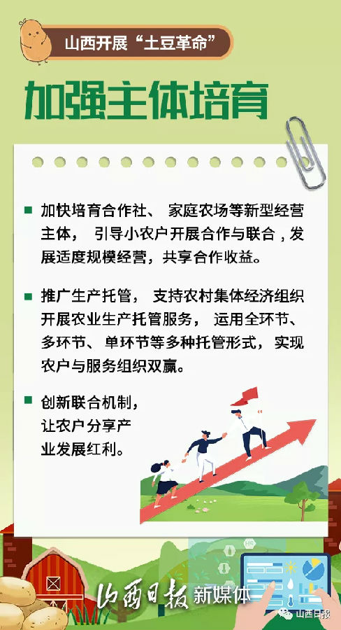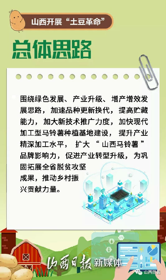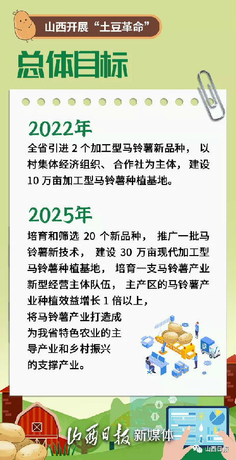 其中提出,山西省2022年将引进2个加工型马铃薯新品种,建设10万亩加工型马铃薯种植基地;到2025年,将培育和筛选20个新品种,建设30万亩现代加工型马铃薯种植基地。