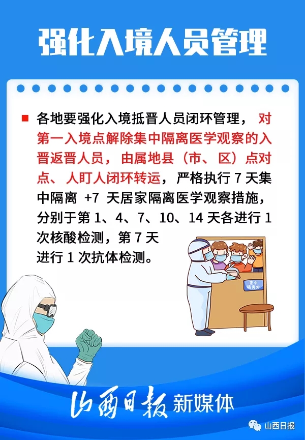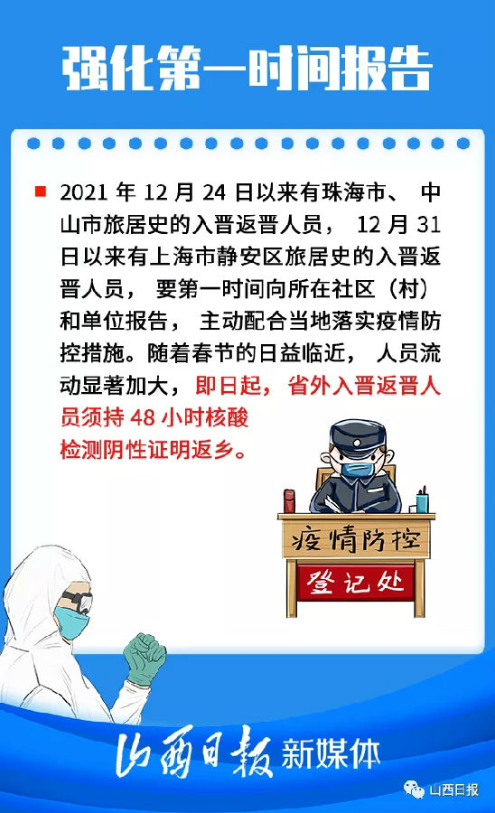 当前国内疫情防控形势严峻复杂,整体呈现局部聚集和多点散发的态势。1月13日,上海市报告5例由境外输入人员复阳感染的本土病例。1月14日,珠海市报告7例奥密克戎本土病例,同时中山市又发现1名与珠海病例有时空交集的阳性病例。目前,上海市静安区1地、中山市坦洲镇1地、珠海市香洲区3地已调整为中风险地区。为坚决防范疫情输入,特别是严防奥密克戎变异毒株输入我省,保障全省人民的生命安全和身体健康,山西省疫情防控办紧急提示如下——