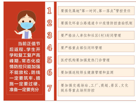 林武强调,当前正值节后返程、学生开学和复工复产高峰期,常态化疫情防控只能加强不能放松,防线一定要筑牢、措施一定要过硬、准备一定要充分。要强化属地“第一时间、第一落点”管控责任,严格风险地区入晋返乡及关联人员排查管控,严格集中隔离、居家隔离和健康监测等制度落实,以县(市、区)为单位强化隔离举措,做到应查尽查、应检尽检、应隔尽隔、应收尽收。要强化环省公路通道卡口疫情防控查验机制,严格实行健康码、行程码、疫苗接种码“三码联查”,做到底数清楚、不落一人。要严格法人单位和社区(村)封闭管理,用好基层网格力量,落实好扫码、测温、戴口罩“三要素”,建立健全社区(村)返乡人员登记制度,确保分级分类管控到位。要严格重点部位闭环管理,扎实做好国际航班经停入境防控,持续强化冷链食品总仓管理,严格执行国际和国内中高风险地区邮件快递物品分区存放、“一件一消毒”等制度,切实斩断物传人的渠道。医疗机构要加强发热门诊管理,落实院感防控措施,杜绝交叉感染。要加强返校师生健康管理和监测,高校要严格落实封闭管理措施,中小学要严格落实点对点管理措施,全面构筑校园安全防线。要加强交通场站、工厂、商超、景区、文化娱乐等重点场所防控,严管聚集性活动,确保常态化疫情防控各项措施落到实处。