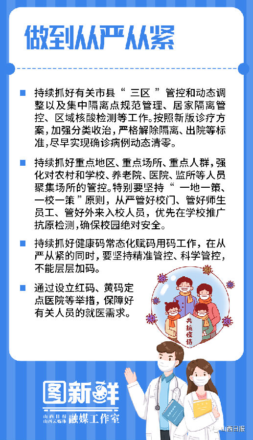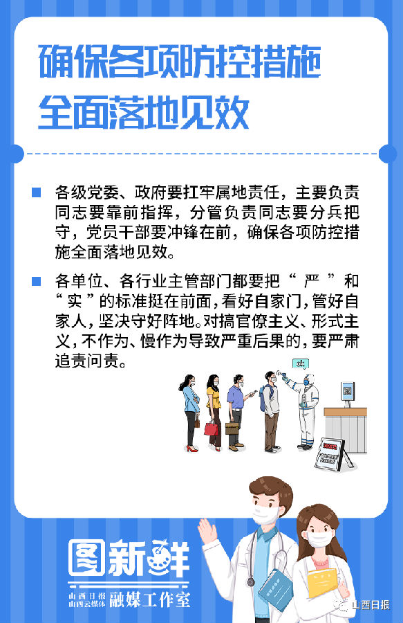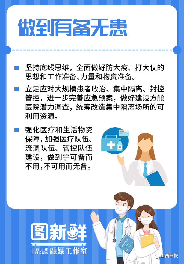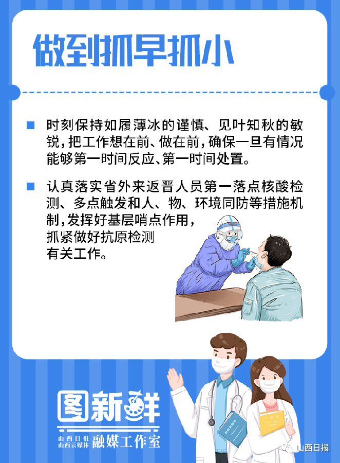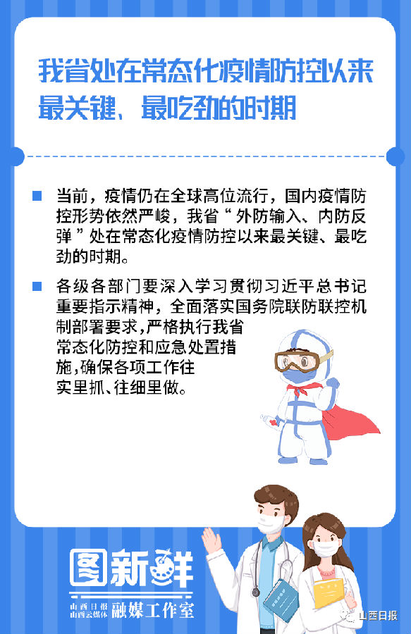 他强调,要把疫情防控摆在全局工作中的重要位置,进一步加强防控能力建设,进一步织密织牢疫情防控网,层层压实“外防输入、内防反弹”责任,坚决守牢山西阵地。