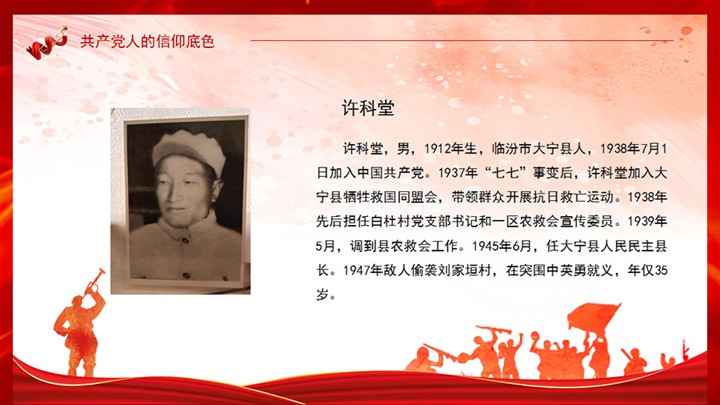 许科堂,男,1912年生,临汾市大宁县人,1938年7月1日加入中国共产党。1937年“七七”事变后,许科堂加入大宁县牺牲救国同盟会,带领群众开展抗日救亡运动。1938年先后担任白杜村党支部书记和一区农救会宣传委员。1939年5月,调到县农救会工作。1945年6月,任大宁县人民民主县长。1947年敌人偷袭刘家垣村,在突围中英勇就义,年仅35岁。