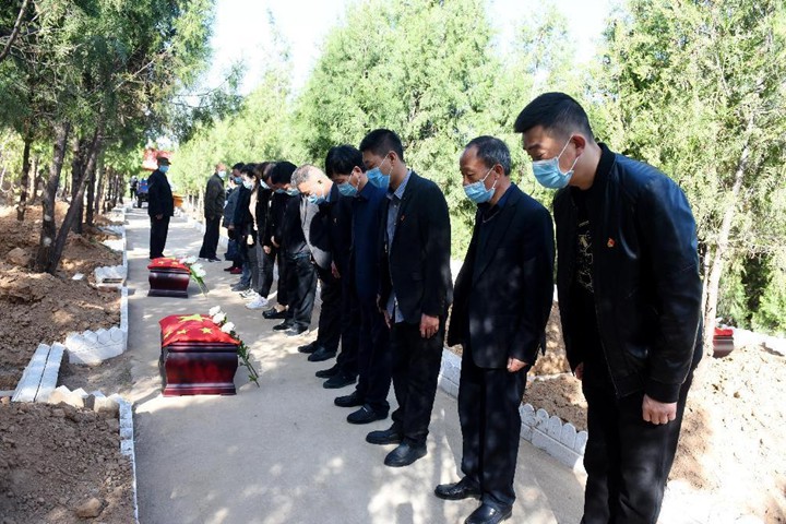 上午9时,入园安葬仪式开始,全体人员肃立,奏唱国歌,向革命烈士默哀。夏县烈士陵园四周松柏青翠,安放烈士遗骸的棺椁上覆盖着国旗。现场气氛庄严肃穆,全体人员神情庄重,花篮缎带上的“革命烈士永垂不朽”字样熠熠生辉。