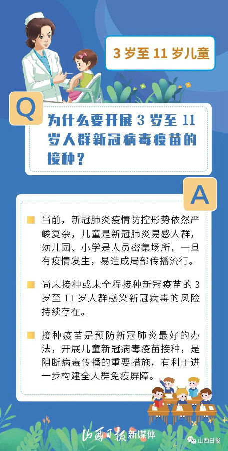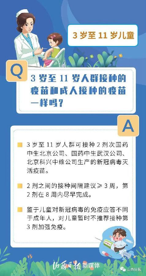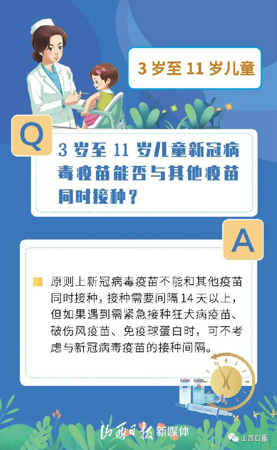 3岁至11岁儿童新冠病毒疫苗能否与其他疫苗同时接种?有基础疾病的老年人能否接种新冠疫苗?如何选择加强免疫接种的疫苗?……连日来,受全国新冠肺炎疫情形势的影响,之前由于各种原因没有接种疫苗以及需要接种加强针的人群,纷纷前往接种点或拨打电话咨询相关问题。近日,针对不同人群普遍关注的疑问,山西省疾病预防控制中心相关专家进行了详细解答。