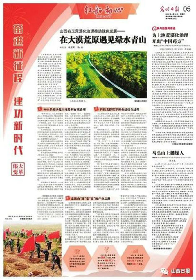 绿化山河、久久为功。右玉这个昔日的“不毛之地”已变成“塞上绿洲”,书写了人类生态史上的奇迹。4月12日,光明日报刊发长篇通讯《在大漠荒原遇见绿水青山》。文章从“90%多的沙化土地得到有效治理”“科技支撑贯穿林业建设全过程”“走出由‘绿’变‘富’的产业之路”三个方面入手,讲述右玉通过荒漠化治理推动绿色发展的故事。同日,新华社播发稿件《山西:2022年采暖季前晋中盆地散煤全面清零》,深入解读《山西省2022年冬季清洁取暖工作方案》,指出我省将聚焦散煤污染问题突出的重点县(市、区),实施中部城市群清洁取暖散煤清零工程。