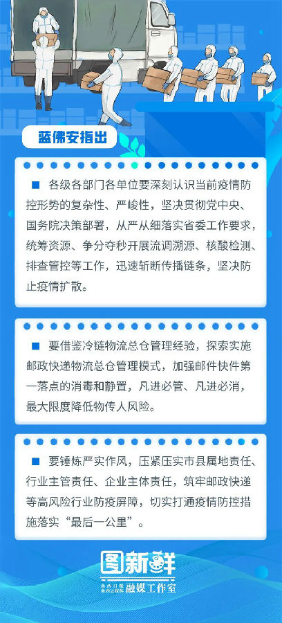 他强调,要切实把思想和行动统一到习近平总书记重要指示要求上来,强化责任担当,狠抓工作落实,争分夺秒做好我省局部快递物流疫情应急处置,扎实做好防输入、防反弹、防外溢各项工作,众志成城全面筑牢阻击疫情防线。