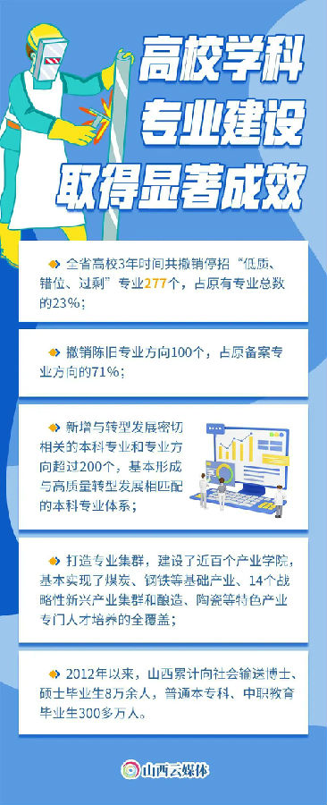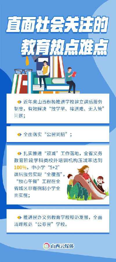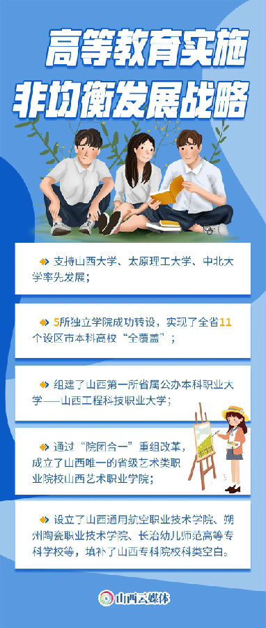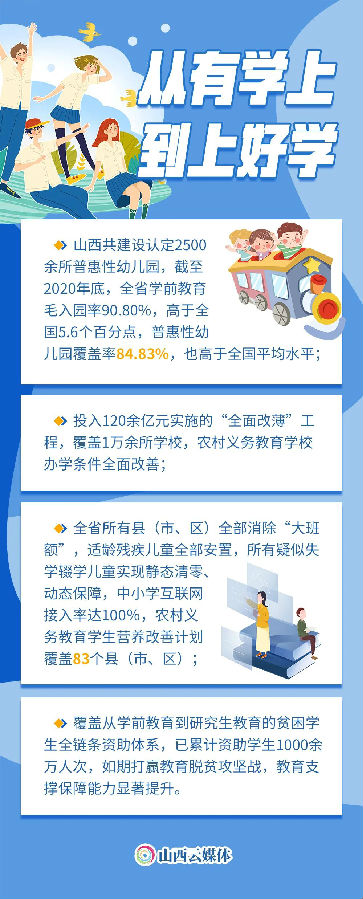 党的十八大以来,在省委、省政府的坚强领导下,山西坚持以习近平新时代中国特色社会主义思想为指引,深入贯彻党的教育方针,把教育摆在优先发展的战略地位,落实立德树人根本任务,强化“五育”并举,持续深化教育改革创新,努力办好人民满意的教育,教育逐渐成为全省经济社会发展的强大动力和人民幸福生活的重要源泉。