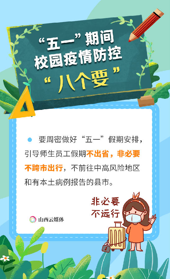 4月27日,省教育厅召开全省教育系统第三十六次疫情防控视频调度会议,安排部署近期特别是“五一”期间教育系统疫情防控重点任务。引导师生员工假期不出省,非必要不跨市出行,不前往中高风险地区和有本土病例报告的县市。
