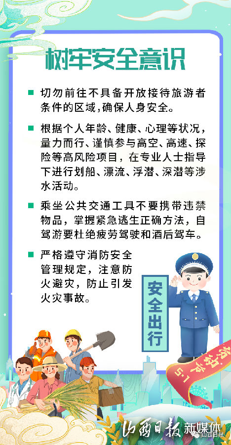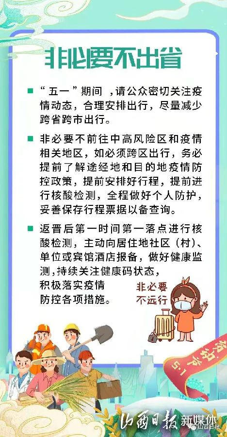 “五一”假期,人员出行、旅游和聚集性活动增加,由于现在还处于疫情防控的关键时期,为了让大家度过一个安全、愉快的假日,以下这几点要牢记,用安全文明点亮旅程!