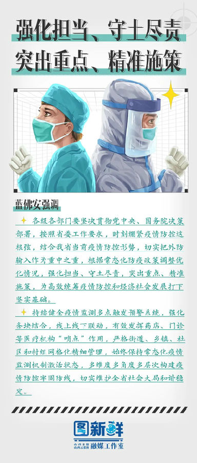 他强调,要深入学习贯彻习近平总书记关于高效统筹疫情防控和经济社会发展的重大要求,坚持疫情防控总策略、总方针不动摇,毫不松懈把“早、快、准”要求落到实处,持续巩固当前来之不易的防控成果,最大限度减少疫情对经济社会发展的影响。