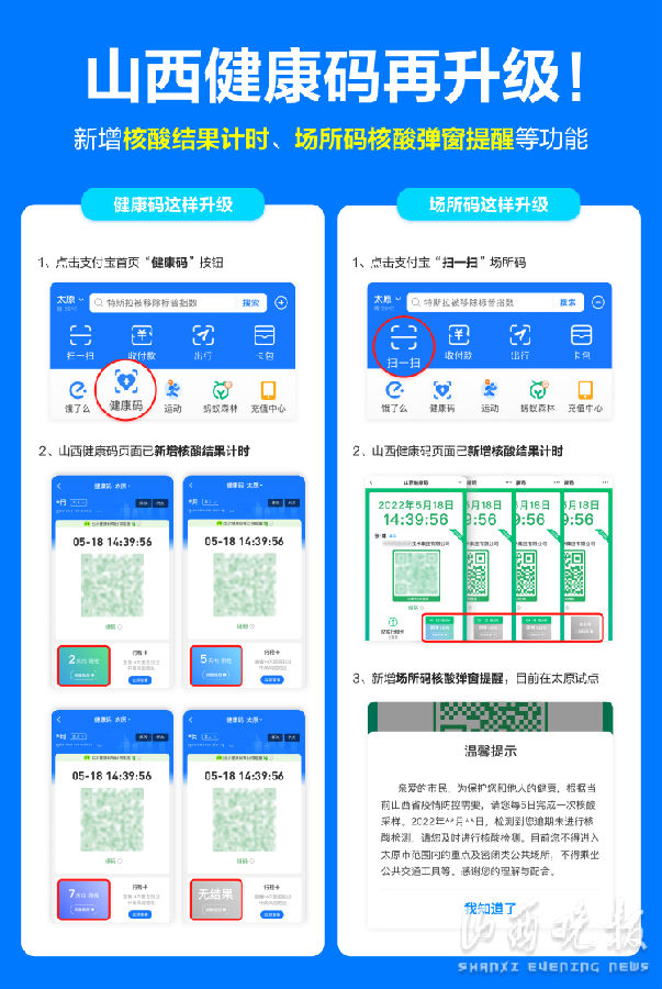 山西健康码再次升级了!5月20日,记者从省卫健委了解到,即日起,山西健康码页面将提供核酸检测结果计时、场所码核酸检测弹窗提醒等服务。