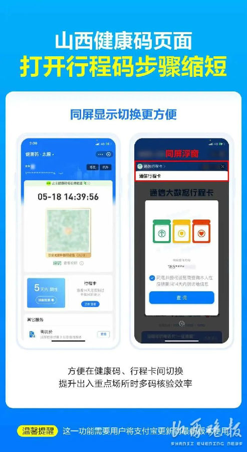 此次更新后,山西健康码、山西场所码页面均已新增了行程卡“同屏”打开功能,方便在健康码、行程卡间切换,提升群众在出入重点场所时多码核验效率。