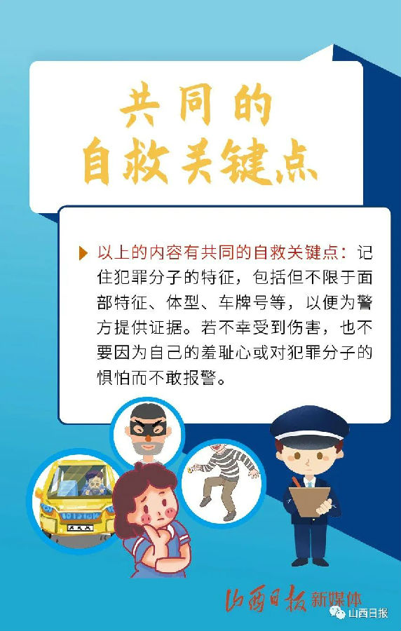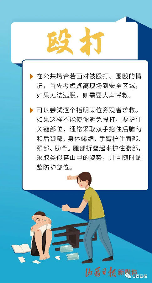 出门在外,安全意识警钟长鸣。人身安全、交通安全、财物安全等……倘若自身安全受到威胁甚至伤害,怎么做才能最大程度地保护自己?一组海报来支招。