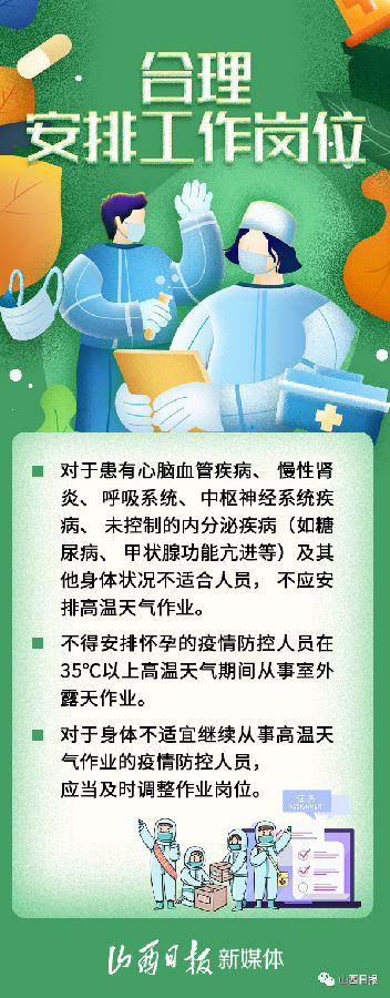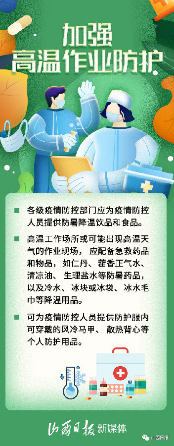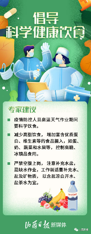 目前,国内疫情还没有完全阻断,疫情防控人员战高温斗酷暑,仍然坚守在一线,为关心爱护疫情防控工作人员,统筹疫情防控和经济社会发展,山西省疾病预防控制中心健康提示如下。