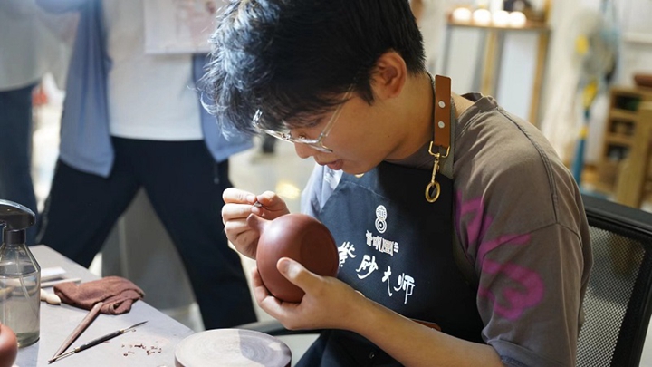 在砂器(紫砂)文化示范区的山西晋明堂文化科技有限公司(以下简称晋明堂),一位年轻人正熟练地运用各种工具给手里的紫砂壶进行壶嘴部分的制作,他叫穆清,今年刚20岁出头的他,耳濡目染父亲对紫砂文化的热爱,也对这一行业产生了浓厚的兴趣,决心将平定紫砂文化传承发扬下去。