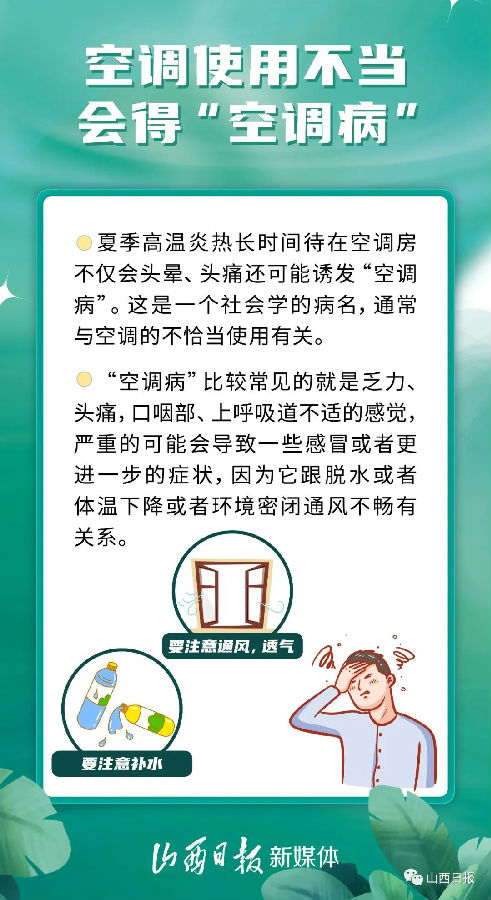 夏季天气闷热潮湿,空调的使用频率也随之增高,不少人只想待在空调房里不出来。然而,过度使用空调很容易患上“空调病”。那么,出现了什么症状可能是空调吹出来的?又该怎么办呢?这份指南请查收!