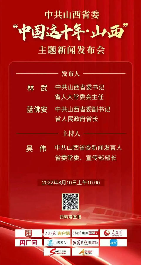 中共山西省委定于2022年8月10日(星期三)上午10:00举行“中国这十年·山西”主题新闻发布会。中共山西省委书记、省人大常委会主任林武,中共山西省委副书记、省人民政府省长蓝佛安将出席发布会,介绍党的十八大以来,在以习近平同志为核心的党中央坚强领导下,全省各项事业取得的历史性成就、发生的历史性变革,以及新时代山西全方位推动高质量发展的生动实践,并回答记者提问。发布会由中共山西省委新闻发言人,省委常委、宣传部部长吴伟主持。