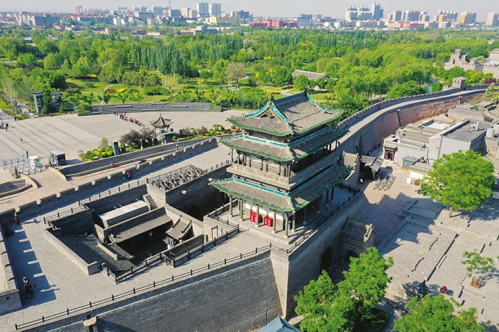 时下的平遥,绿意葱茏,蓝天白云下的古城墙愈发雄壮恢宏。登上城墙放眼望去,城中古寺古塔、古街古楼,与商铺民居、绿地公园等一道,沿着城市中轴渐次排开,一座古今融合、生态宜居的魅力县城尽收眼底。