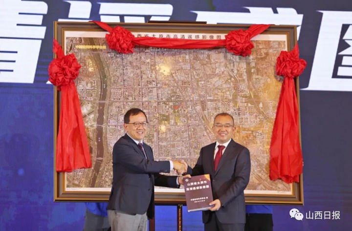 ▲中国空间科学学会向山西省政府赠送太原市高清遥感影像图