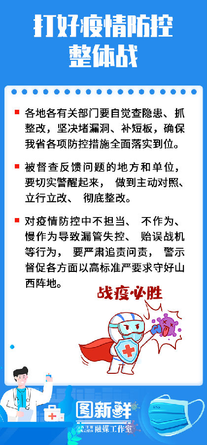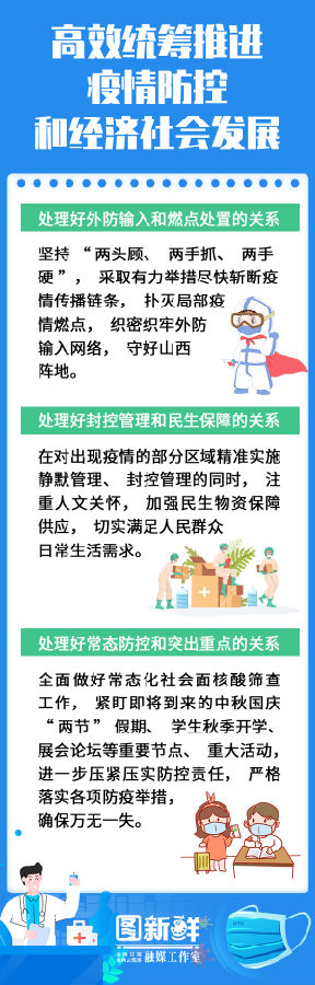 他强调,坚持就是胜利,要坚决贯彻疫情防控总策略和总方针,严格落实省委“早、快、准”要求,把各方责任扛起来,把处置速度提上去,把防控细节做到位,坚决打赢这场疫情防控阻击战攻坚战,牢牢守住山西阵地。