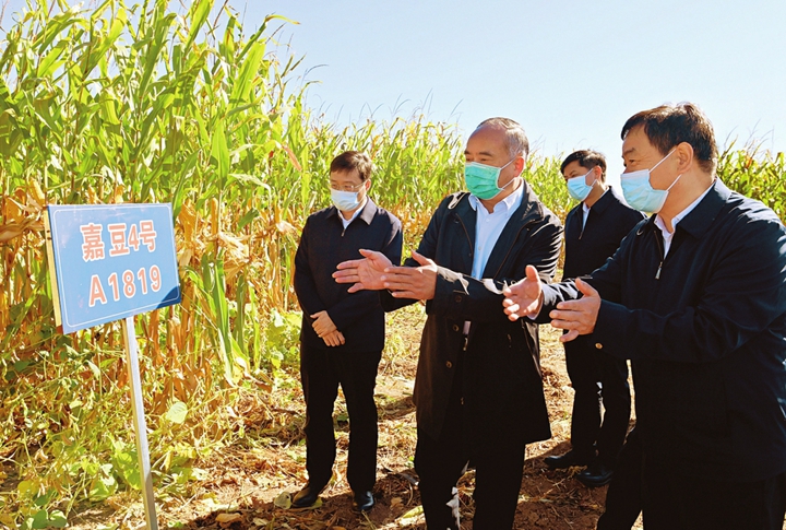 9月23日,省委书记林武来到太原市小店区西温庄乡南王名村的大豆玉米带状复合种植基地,详细了解往年收成和今年情况,同基地负责人一笔一笔算成本账、收益账。山西日报记者史晓波摄