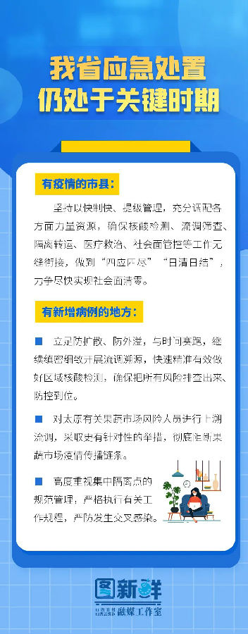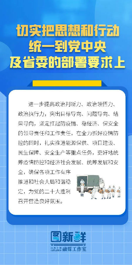 他强调,要提高政治站位,扛牢政治责任,毫不动摇坚持疫情防控总策略总方针,认真落实省委“早、快、准”要求,加快推动疫情见底清零,抓实抓细常态化防控工作,坚决打赢这场疫情遭遇战阻击战歼灭战,坚决守牢疫情防控山西阵地,以实际行动和优异成绩迎接党的二十大胜利召开。