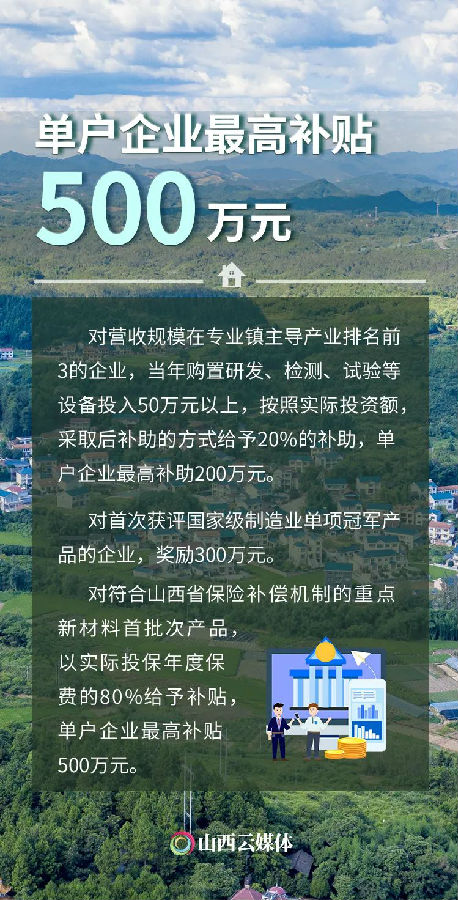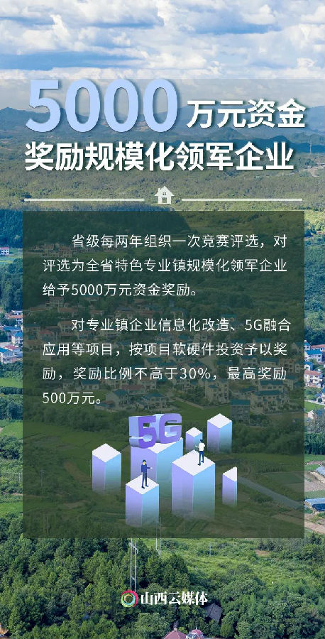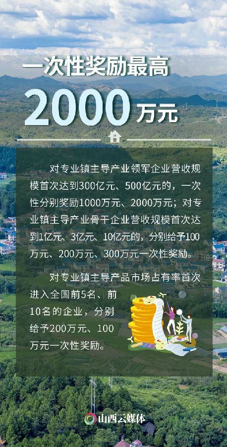 近日,山西省人民政府办公厅印发《山西省支持专业镇高质量发展的若干政策》,促进专业镇高质量发展。一组数据聚焦“硬核”举措,看看支持力度有多大。