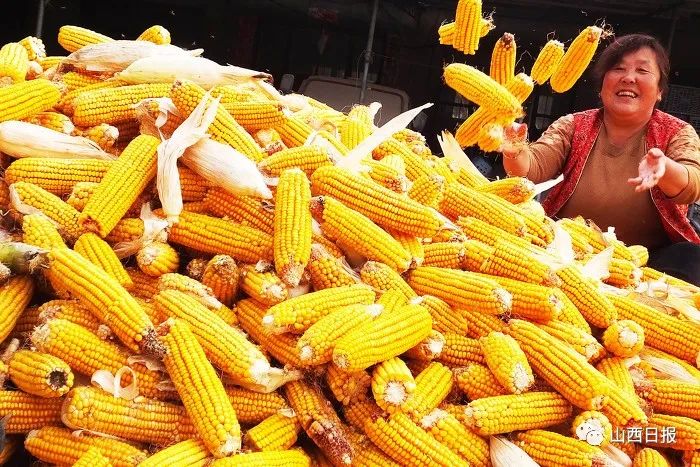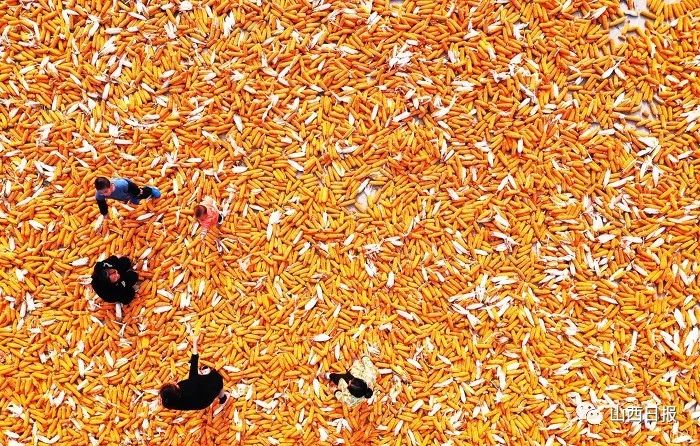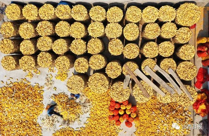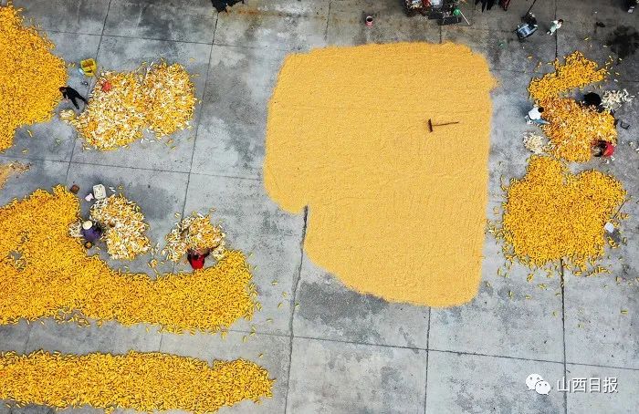 ▲新绛县掌镇光村,村民和孩子晾晒玉米成风景。