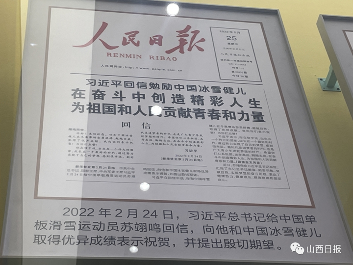 这是今年2月24日,中共中央总书记、国家主席、中央军委主席习近平给中国单板滑雪运动员苏翊鸣的回信,向他和中国冰雪健儿取得优异成绩表示祝贺,并提出殷切期望。在“奋进新时代”主题成就展中央综合展区,这封回信与苏翊鸣登上冬奥会单板滑雪男子大跳台领奖台的照片一同展出,展现出新时代中国青年自信开放的新形象。