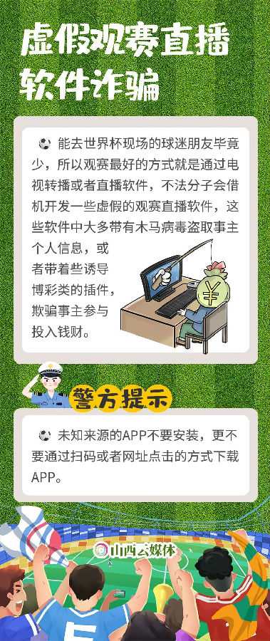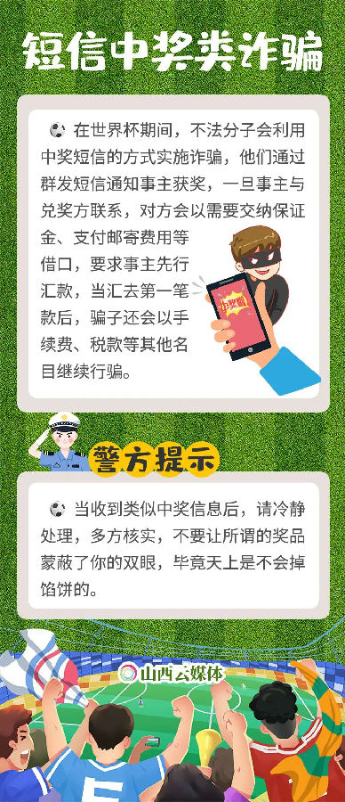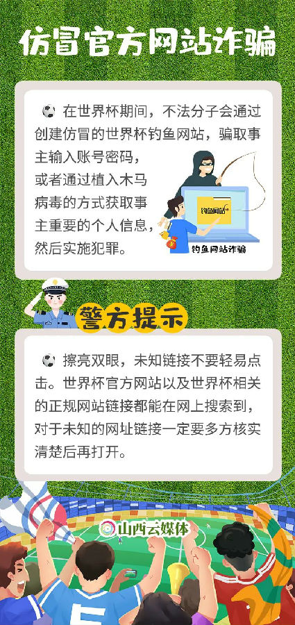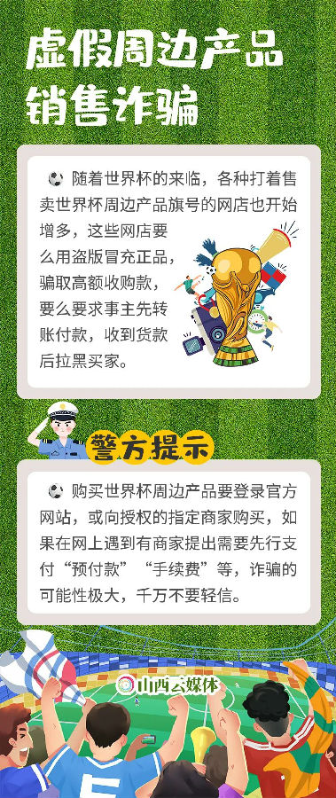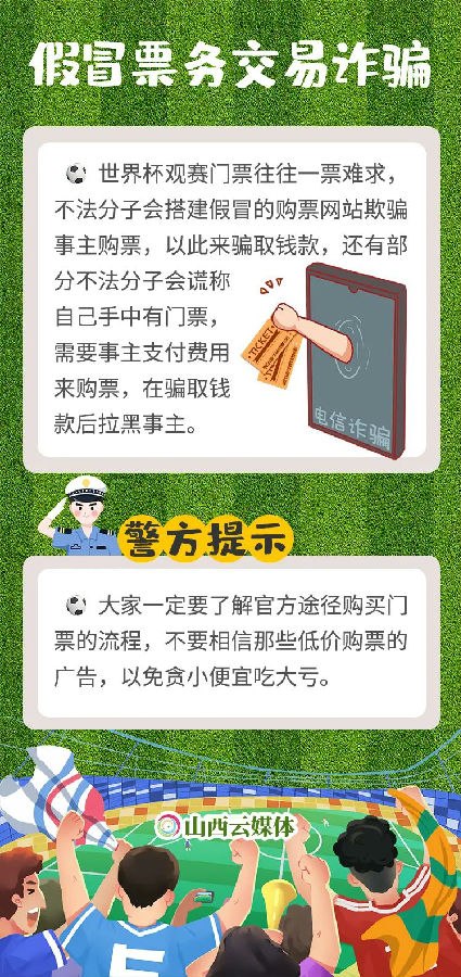 四年一届的世界杯正式开赛啦!球迷们享受视觉盛宴的同时,一些不法分子也蠢蠢欲动起来。为避免世界杯成为“骗子的狂欢”,球迷们一定要对这些网络诈骗手段提高警惕!
