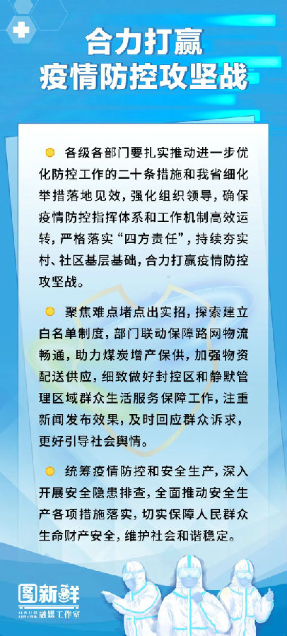 林武强调,要把思想和行动统一到习近平总书记重要指示批示精神上来,保持战略定力,坚定必胜信心,全面落实第九版防控方案和二十条优化措施,坚决做到不动摇、不走样,高效统筹疫情防控和经济社会发展,坚决打赢这场阻击战攻坚战。