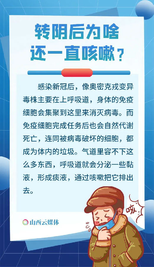 “咳咳咳、咳咳、咳咳……”最近,许多家庭里的咳嗽声此起彼伏,部分新冠感染者在转阴后,仍有咳嗽的情况。转阴后为啥还一直咳嗽?多长时间咳嗽会消失?一直咳会不会引发肺炎……这些大家关心的问题,权威解答来了!