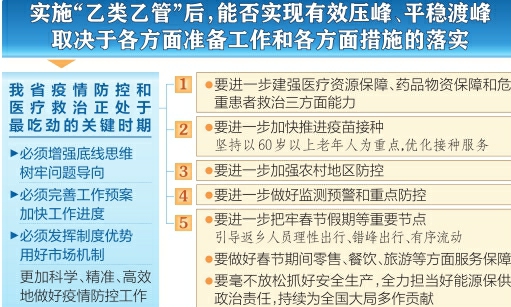 蓝佛安指出,实施“乙类乙管”后,能否实现有效压峰、平稳渡峰,取决于各方面准备工作和各方面措施的落实。近一段时间,省委强化调度指挥、持续作出部署,通过扩容医疗资源、提升药品产能、强化农村地区用药保障、建强机动救护队伍等举措,确保了全省防控工作转段总体平稳。同时要看到,我省疫情防控和医疗救治正处于最吃劲的关键时期,必须增强底线思维、树牢问题导向,必须完善工作预案、加快工作进度,必须发挥制度优势、用好市场机制,更加科学、精准、高效地做好疫情防控工作。一要进一步建强医疗资源保障、药品物资保障和危重患者救治三方面能力,加强发热门诊设置和管理,健全分级诊疗机制,推广互联网诊疗服务,强化退热类药品等医疗物资生产调度,强化重症监护救护资源力量储备,全力做到响应及时、服务到位、保障有力。二要进一步加快推进疫苗接种,坚持以60岁以上老年人为重点,优化接种服务,持续提高老年人群全程接种和加强接种的覆盖率。三要进一步加强农村地区防控,组织城市医疗资源向农村下沉,加快提升乡镇卫生院、村卫生室接诊能力,畅通市县乡村上下就医转诊通道,加强县医院重症救治能力建设,争分夺秒完成农村群众主要常备药免费发放工作。四要进一步做好监测预警和重点防控,准确掌握本地区新冠病毒感染走向、发热门诊及重症床位储备使用、农村重症患者转诊、基本药品可及性等方面具体数据具体情况,坚持问题导向,并有针对性采取相应措施。按规定压实养老机构、学校等重点场所防控责任,扎实做好老年人、儿童、有基础性疾病患者、孕产妇、血液透析患者等重点人群的健康服务。五要进一步把牢春节假期等重要节点,有效应对春运客流高峰,引导返乡人员理性出行、错峰出行、有序流动,做好学校寒假期间有关工作,引导群众加强自我健康监测,减少病毒感染扩散风险。同时,要做好春节期间零售、餐饮、旅游等方面服务保障,确保粮油肉蛋奶果蔬等重要民生商品数量充足、价格稳定,加强对困难人员的帮扶救助力度。要毫不放松抓好安全生产,全力担当好能源保供政治责任,持续为全国大局多作贡献。