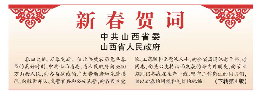 春回大地,万象更新。值此共度农历兔年春节的美好时刻,中共山西省委、省人民政府向3500万山西人民,向各条战线的广大劳动者和先进模范,向驻晋部队、武警官兵和公安民警,向各民主党派、工商联和无党派人士,向全省离退休老干部、老同志,向关心支持山西发展的海内外朋友,向节日期间仍奋战在生产一线、坚守工作岗位的同志们,致以新春的问候和美好的祝福!